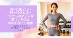 2月から始める人が、夏にいちばん余裕を持てる理由 「ダイエットは夏前からでいいかな」と考えていませんか? 実は、体が本当に変わり始めるまでには"準備期間"が必要です。 特に30〜40代女性の場合、体が動きに慣れ、筋肉が目 […]